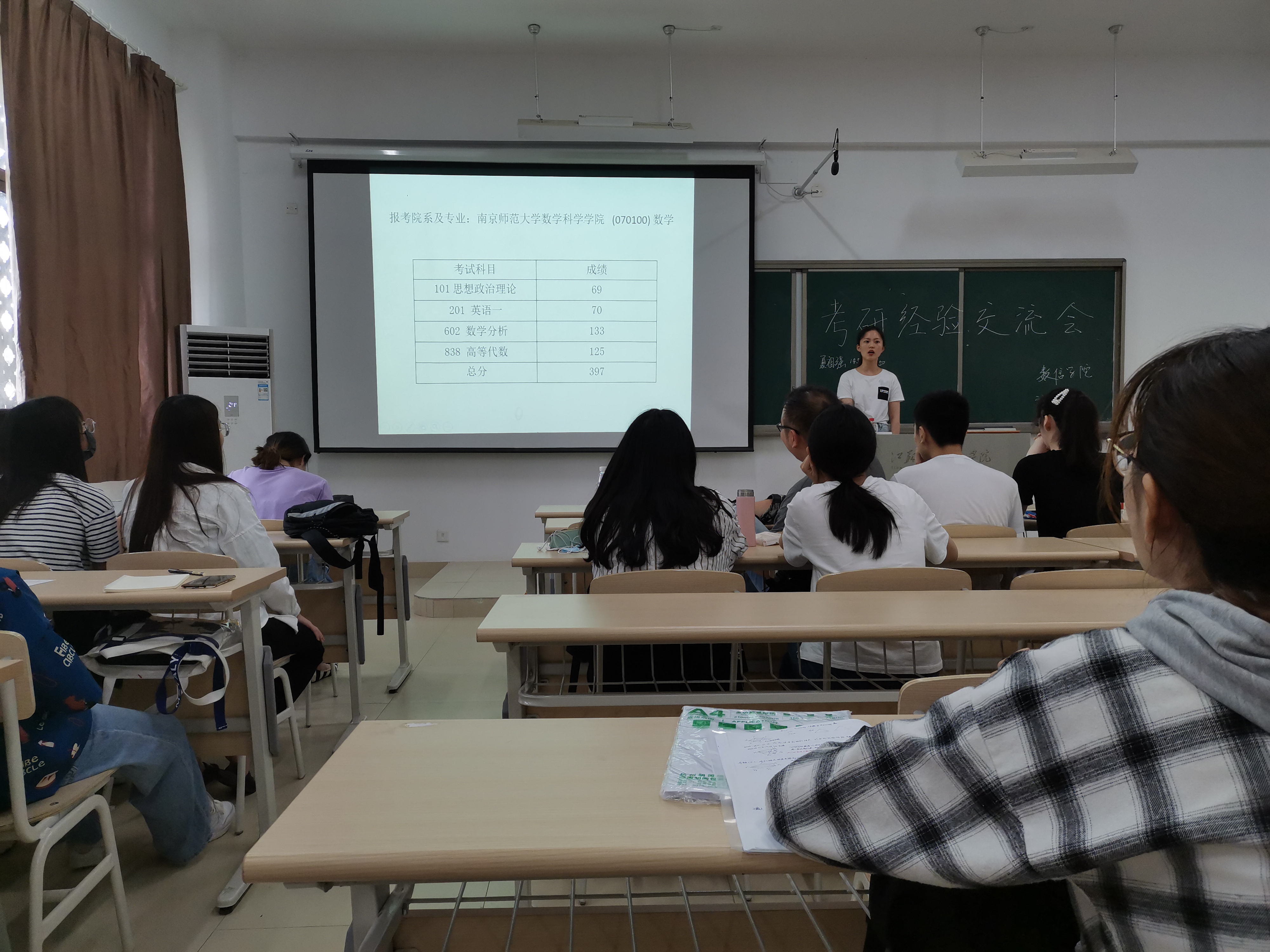 会议伊始,陈院长为同学们介绍了韦思瑶、李敏等6名学生拟录取的院校及专业,并对前来交流会的同学表示欢迎。其后,李敏、汪佳念、夏祖强、强伟婧、韦思瑶依次上台分享详细的考研复习过程,他们就各自的专业所考科目类别、各科复习资料、复习方式及复试需要注意的一些问题提出了自己的建议。他们指出,考研需要早作准备,尤其是英语,需同学们坚持每天背诵,否则容易生疏。其中,汪佳念同学特别介绍了如何选择合适的学校及专业,为不少还未确定专业学校的同学指明了考研方向。