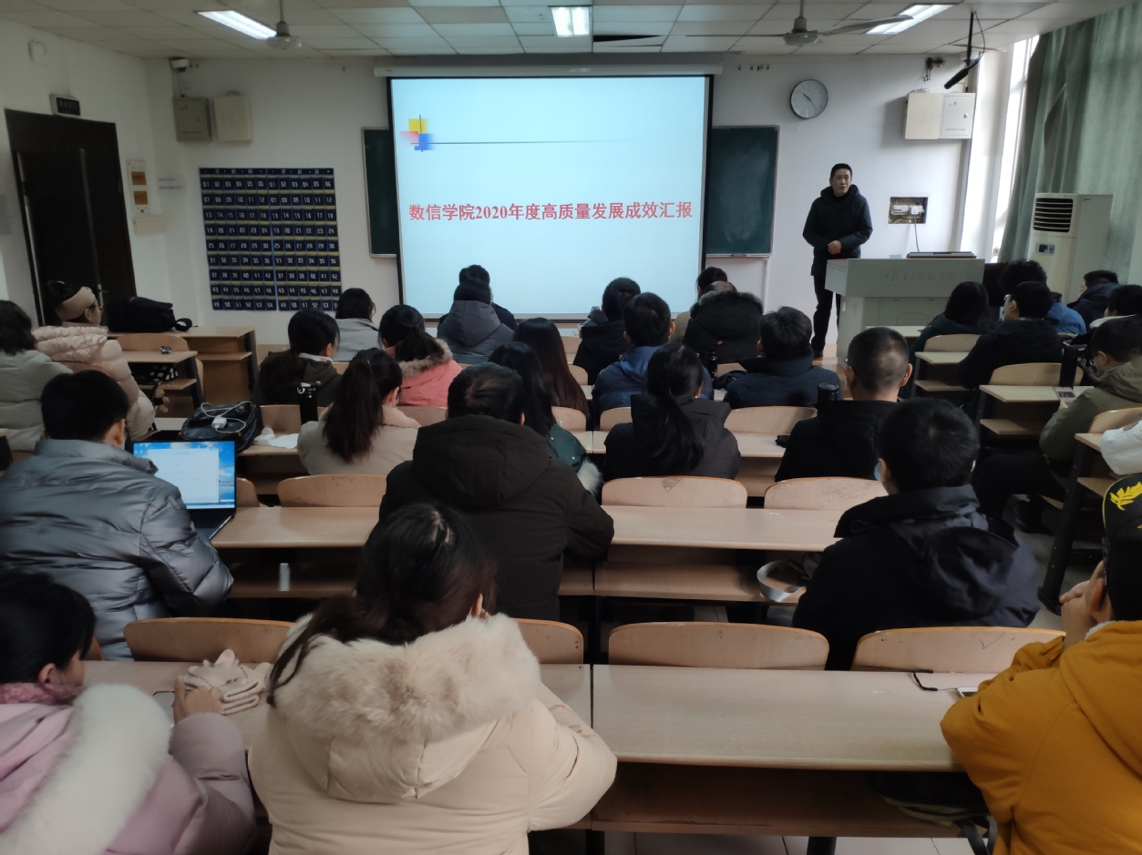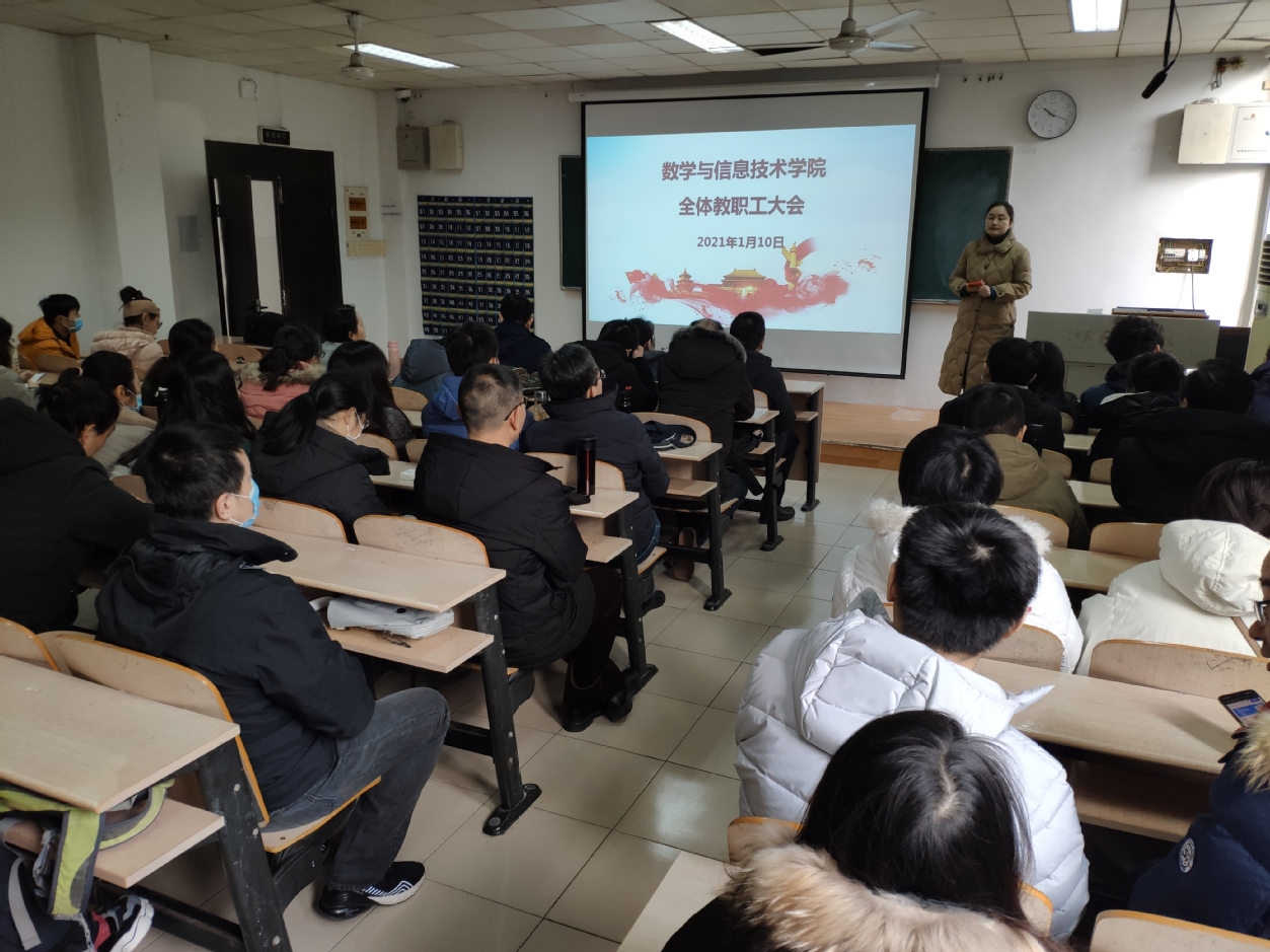 2021年1月10日上午,数信学院在草场门校区教2楼203教室召开2020年学院全体教职工大会。学院领导班子和全体教职工参加,会议由院党总支副书记、分工会主席陈艳主持。