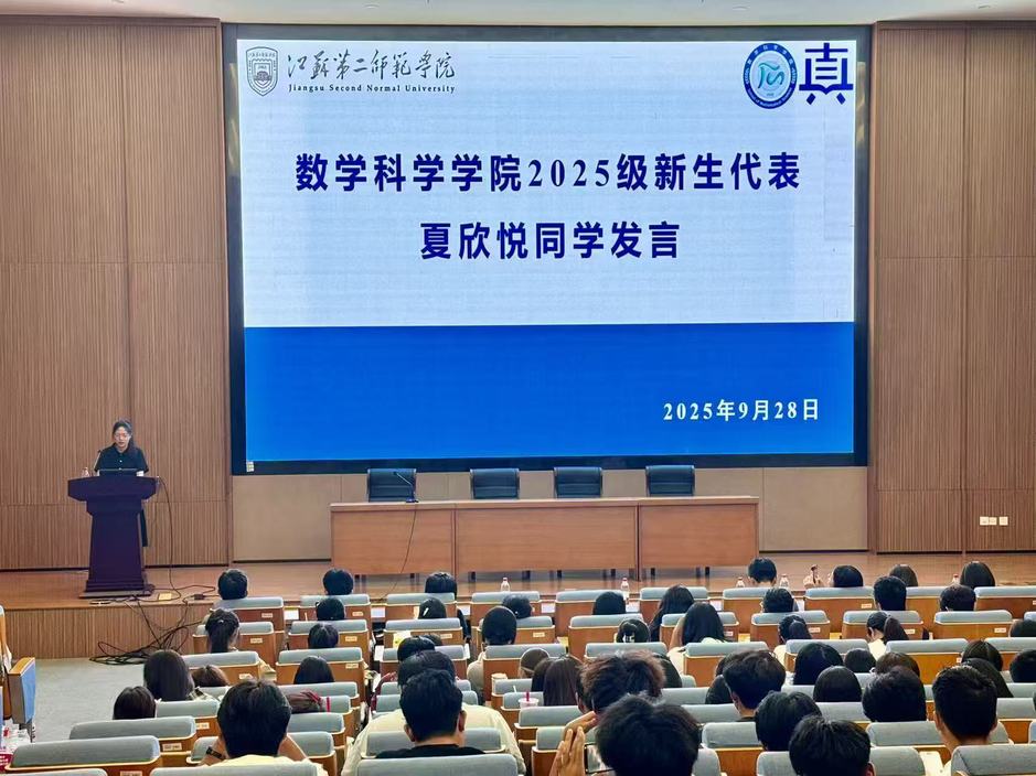 新生代表、2025 级数师一班夏欣悦同学在发言中,首先向学院全体老师的辛勤付出表达感谢与敬意,随后分享了自己对大学生活的憧憬与期待,并号召全体新生始终保持进取之心,以追求真理、勇攀高峰的态度探索专业知识,用奋斗书写无悔的青春篇章。