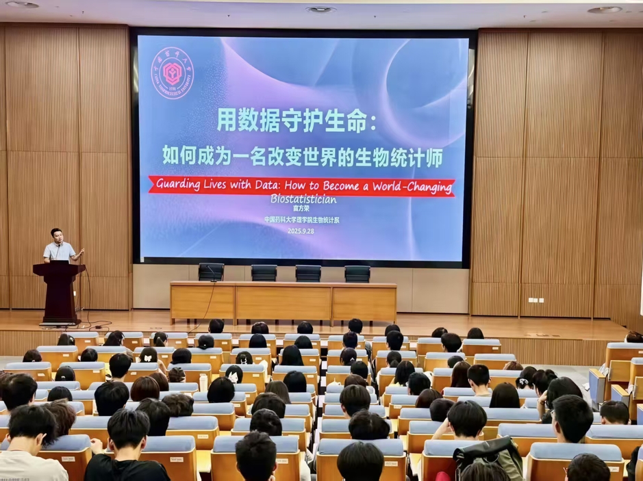 典礼开始,言方荣结合自身求学与科研经历,以《用数据守护生命-—如何成为一名改变世界的生物统计师》为题展开分享。他详细讲解了生物统计师的核心工作内容与实践路径,重点介绍了如何通过大数据技术预测疾病趋势、助力新型药品研发,为重大疾病防控提供科学支撑,为新生搭建起专业认知的初步框架。