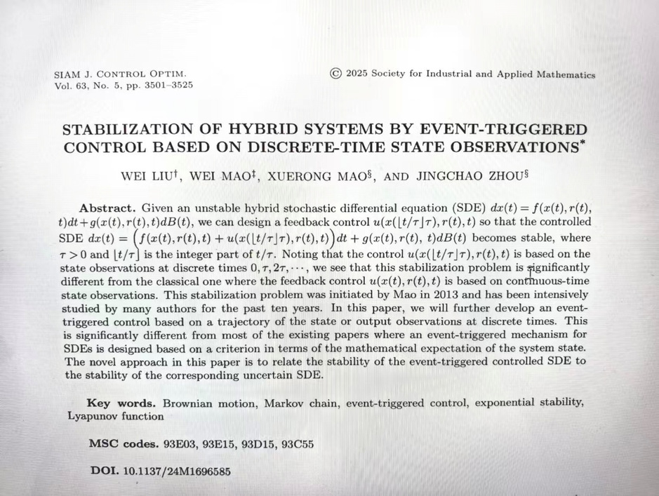 近日,数学科学学院毛伟教授及合作团队在控制领域顶级期刊SIAM Journal on Control and Optimization发表题为Stabilization of Hybrid Systems by Event-Triggered Control Based on Discrete-Time State Observations的研究论文,毛伟教授为论文通讯作者,目前他在控制领域三大顶刊均有成果发表。