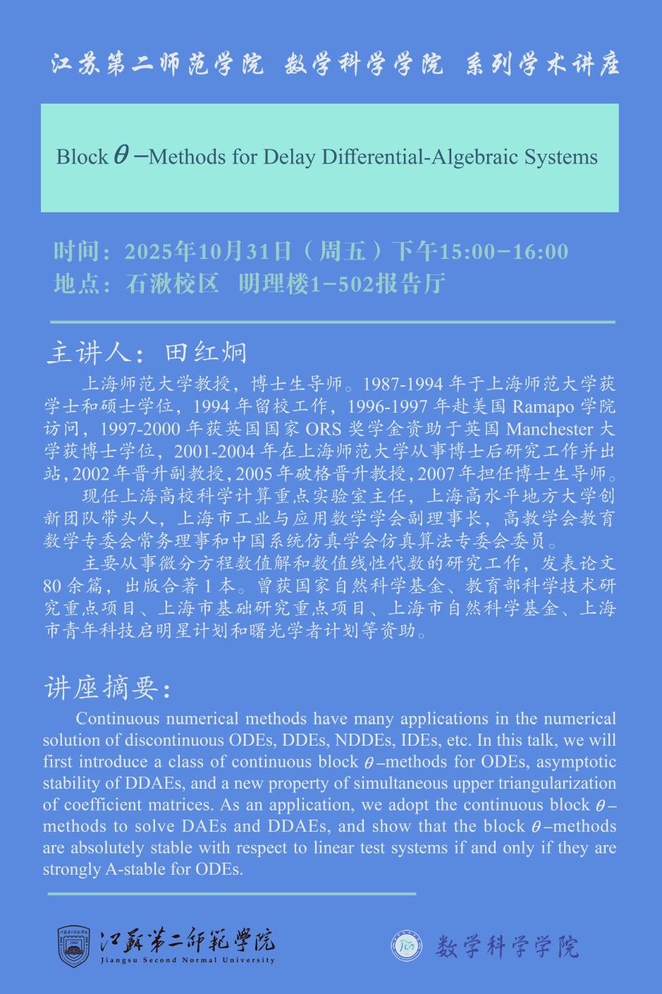 学术讲座预告10月31日---Block Methods for Delay Differential-Algebraic Systems