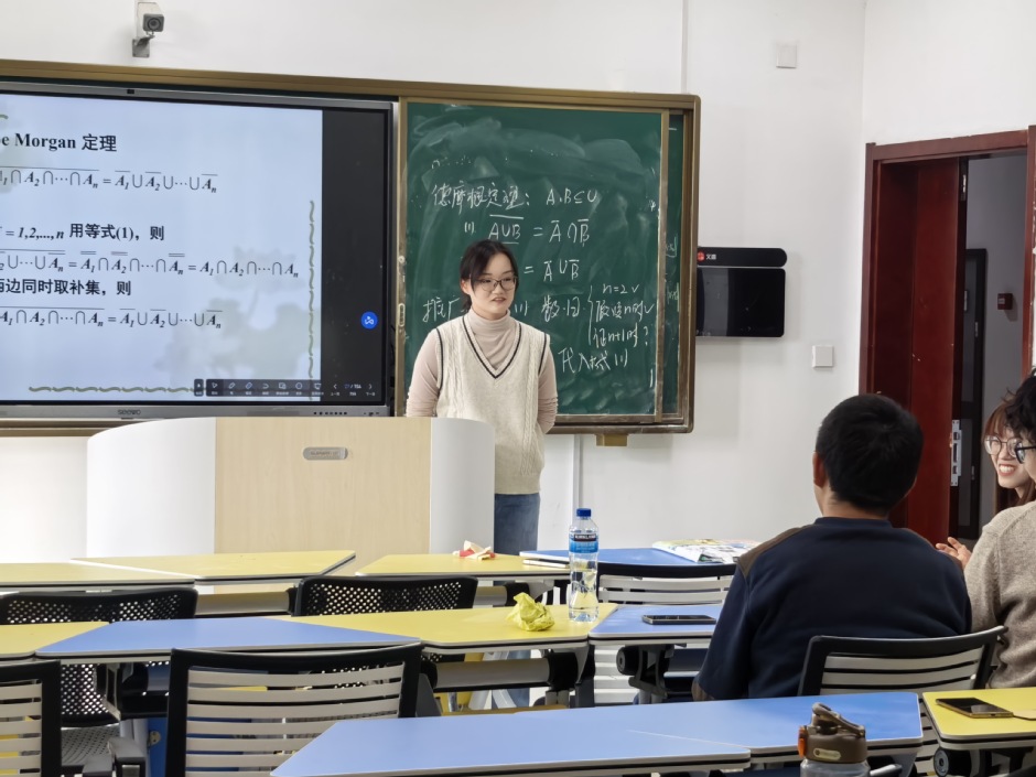 本次活动紧扣学科教学需求,分设数学专业组、统计专业组、大学数学组三个组别开展授课研讨。数学专业组中,梁一星老师以“函数极限概念”为授课主题,通过实例引入、逻辑拆解,将抽象的数学概念转化为易懂的教学内容;李玉莹老师围绕 “德摩根定理”授课,先借集合运算旧知铺垫,再用韦恩图直观呈现定理核心结论,结合数学语言完成证明,还通过不等式求解实例演示定理应用,明确适用范围与注意事项。