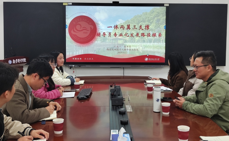 11月17日下午,应我校数学科学学院与求真书院联合邀请,南京信息工程大学遥感与测绘工程学院朱亚宾老师在明理楼1-502会议室,为求真书院全体辅导员作了题为“一体两翼三支撑——辅导员专业化发展路径探索”的专题报告。本次会议由数学科学学院院长卢涛主持,书院全体辅导员参与交流。